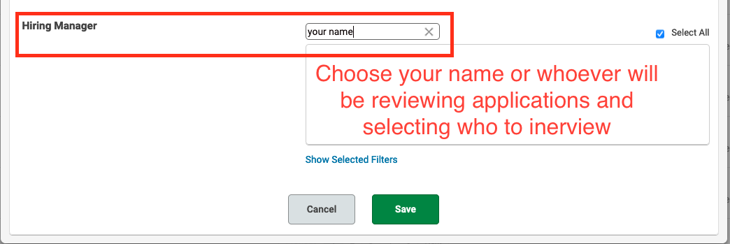 You will select yourself or whoever will be reviewing and selecting applicants for interviews in the hiring manager box.